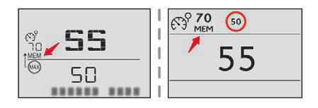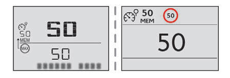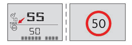 Jeśli różnica między ustawieniem prędkości a wartością wyświetlaną przez układ rozpoznawania ograniczenia prędkości jest mniejsza niż 10 km/h, symbol MEM nie jest wyświetlany.